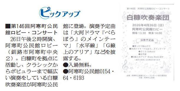ピックアップ!第146回 阿寒町公民館ロビー・コンサート