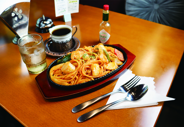 同店のイチオシは、定番ナポリタンに、アサリ・ホタテ・エビ・イカの贅沢具材の旨みが凝縮されたシーフードナポリタン。特にホタテは刺身でも頂ける鮮度抜群のものにこだわっています。もっちり太麺が濃い目の味付けにマッチして食欲を駆り立てます。