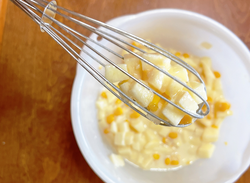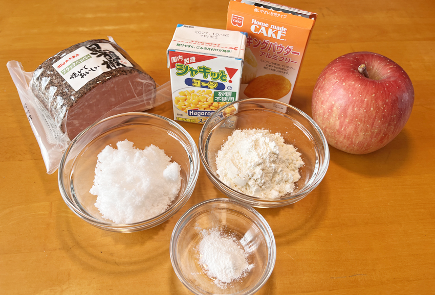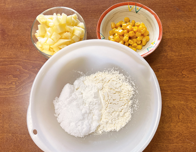 ・ボウルにスイート・コーン大さじ二杯、小麦粉37.5㌘、砂糖37.5㌘、ベーキングパウダー少々、リンゴ半個を入れて混ぜ合わせる
