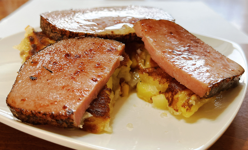 本来なら、立派なブロックハムを厚切りにするのが正解なのだが、スーパーで手に取ったハムの塊の値段におののき、お財布事情を優先させて「ハムもどき(ボロニアソーセージ風)」で代用することとした。恨むべし物価高。