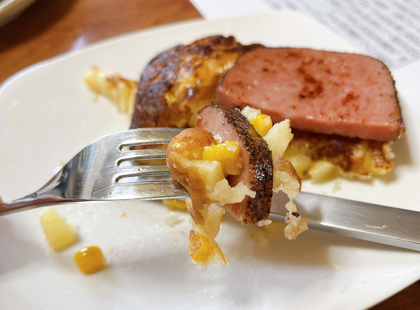 コーンブレッドというアメリカの伝統的なパンはあるものの、スイートコーンを混ぜ込んだ生地とは別物である。今回のレシピでは残念ながら「そういやコーンもいたなあ」という程度だった。