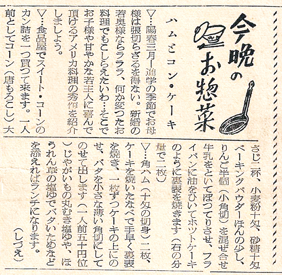 別件で過去の古い新聞記事を探していたら、「今晩のお惣菜」と称したレシピコーナーがひっそりと連載されているのを見つけた。1956年、なんと70年前である。