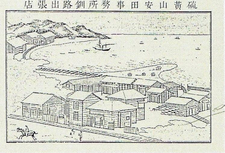 明治23年発行の北海立志図録の硫黄山安田事務所を見ますと、釧路川に突き出た砂州、硫黄を知人へ運ぶ軌道、煙を上げた汽船などが見え、明治23年ごろの洲崎町の様子を伝えています。釧路川上流で採掘された硫黄の輸出の拠点が、釧路港の汽船に硫黄を積み込む基地の役割を果たしたのが釧路川河口沿の洲崎町です。