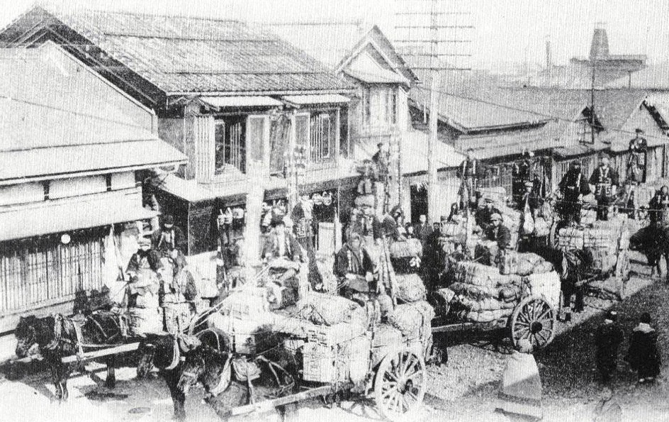 写真は大正4年ごろの洲崎町1丁目、佐々木米太郎商店の正月恒例の初荷の光景です。土蔵造りの店頭に勢ぞろいした馬車、山のように積まれた荷物、威勢のよい男たち、当時の活力ある釧路を連想させる光景です。洲崎町1丁目は現在の大町6丁目ですが、佐々木米太郎商店の並びには、土蔵、商店が並び洲崎町通の繁栄を伝えています。