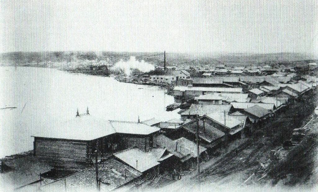 川沿いに住宅が並び、煙突と白い煙が見えます(現在の久寿里橋付近)。明治40年10月に釧路の有力者武富善吉、佐々木与兵衛らが設立した「釧路製材造船合資会社」です。工場の見える街並みからは、釧路川で流送された木材を近代的な設備で製材する新しい産業によって、夢の実現に挑戦する黎明期の釧路人たちのバイタリティーが感じられます。