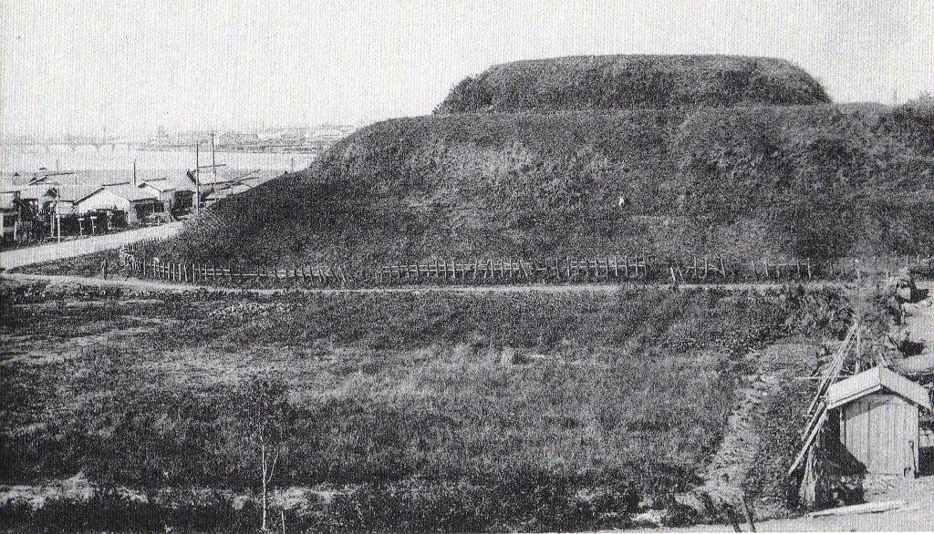 写真は大正時代の御供山ですが、釧路川が近くまで迫り、周りには人家も少なく、アイヌの人たちが、サルシナイ(芦の生えている沢)と呼んだ様子が伝えられています。今は文化財の保護のために柵が設けられ、自由に入ることができませんが、釧路川に中島があった時代のモシリヤの記憶を伝えています。