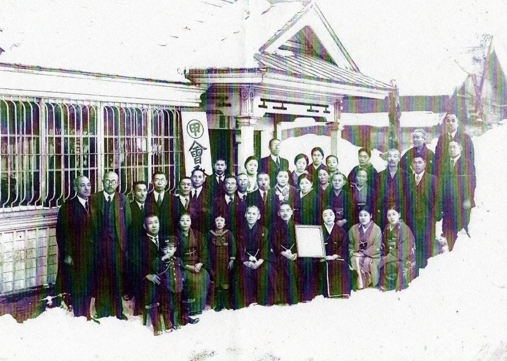 昭和20年代中ごろの城山町(現在の城山交番近く)に古い大きな邸宅があり、茅野さんと呼んでいました。祖母から元釧路市長さんの家で祖父が囲碁の相手をしていたと祖父の想い出話を聞かせてくれました。写真は子どもの頃の記憶に残る茅野邸の玄関前で、茅野満明さんを中心とした集合写真です。