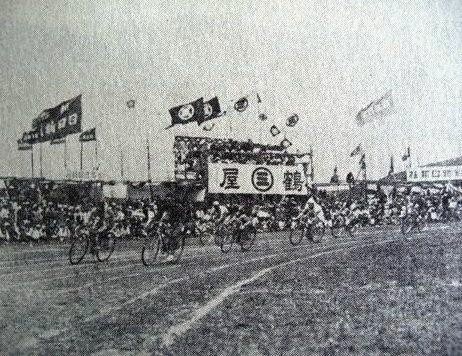 写真は市民運動会の自転車競技の様子ですが、競技場の周りには丸三鶴屋の看板の見える丸太組の見物席、会社、商店の旗、大勢の観衆が集まっています。市民運動会当日は北大通商店街も休日で、会場が市民の交流会場でした。
