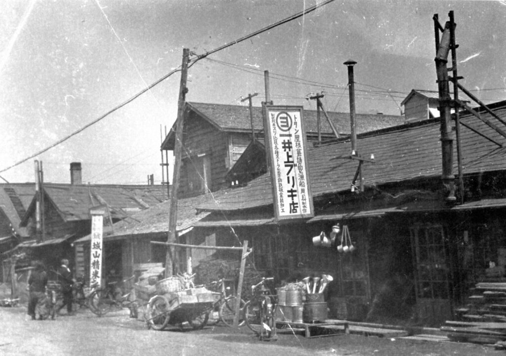 写真は昭和20年代終わりごろの城山町(現喫茶ルフランの近く)のブリキ店の様子です。年代を感じさせる木造平屋の店頭にブリキ製品を並べた店舗と作業場と自宅も兼ねています。