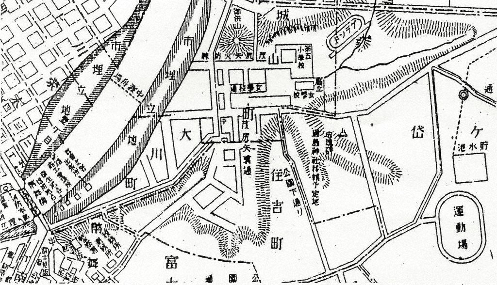 昭和7年に実施された字名地番改正の町名説明の中で大川町、城山町について、旧茂尻矢の一部並びに新埋め立て地の一部と説明しています。新埋め立て地は釧路港開港百年記念誌に掲載された釧路川の埋め立ての様子を伝える図(昭和7年ごろ)を見ますと、幣舞橋の上流の釧路川河岸の左右に市埋め立て地と記載され、幣舞橋から鉄橋までの茂尻矢の釧路川沿いが埋め立て地でした。現在の日本銀行付近は釧路川を埋め立てしてできた土地です。