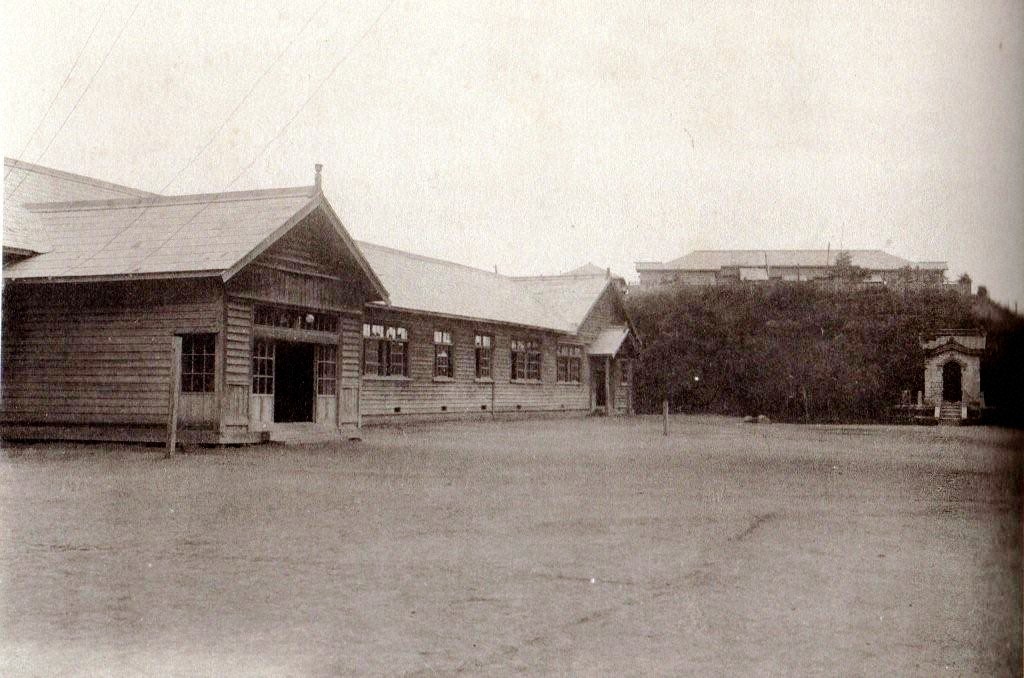 写真は木造平屋建ての昭和7年ごろの釧路第5尋常高等小学校(現城山小学校)です。校舎は昭和18年11月14日の火災で焼失しましたが、戦後の混乱期の昭和21年に再建されました。昭和22年には釧路市立城山小学校として新しい時代を迎えますが、再建された校舎には、お供山の四季、木材の流送、製材所の鋸の音、市民運動会の歓声などの茂尻矢の記憶を受け継いでいます。現在の校章はモシリヤチャシ跡、城跡、第5尋常小学校と茂尻矢の記憶を伝えています。