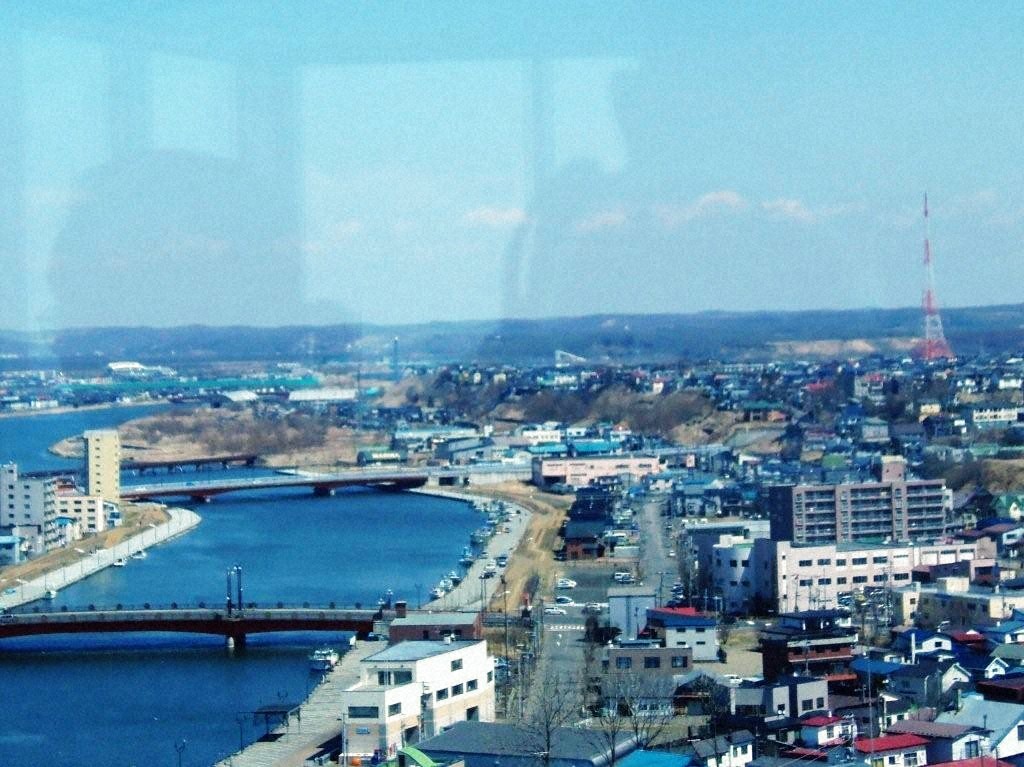 まなぼっと幣舞10階展望室から見た、大きく蛇行する釧路川、久寿里橋、旭橋、鉄橋、整備された河畔と釧路川左岸には、高層マンションと住宅街の城山、河畔に空き地が目立つ街並みの材木町の様子です。往時には茂尻矢と呼ばれ、釧路川上流から運ばれた木材の集散地でマッチの軸木と製材工場が並び職人の長屋が密集し釧路の木材産業を支える町でした。