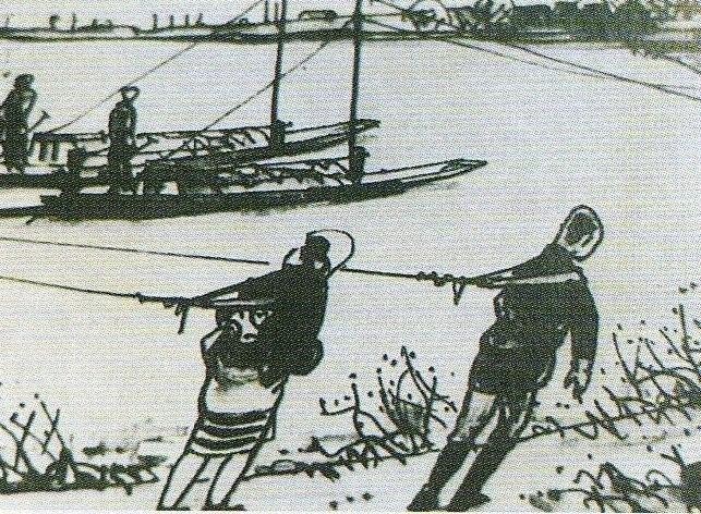 曳き舟は、帆柱の上から綱を数本引き3、4人がこれを肩にかけて岸に沿って進むという重労働で、釧路の古老談の中で体験をした細川杢蔵も一度で辞めたと話しています。