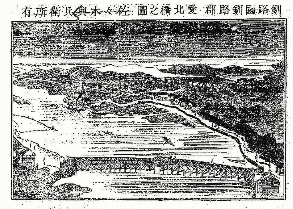 明治19年に宮本郡長は、釧路川の架橋を上申しますが、架橋はなりませんでした。しかし、橋は明治22年9月22日に初めてできました。宮本郡長の勧めにより、名古屋に本社がある愛北物産合資会社が私費で架けました。橋の名前は、架設者にちなみ「愛北橋」と命名され、長さ216㍍、幅3.6㍍で、当時の北海道で一番長い橋でした。