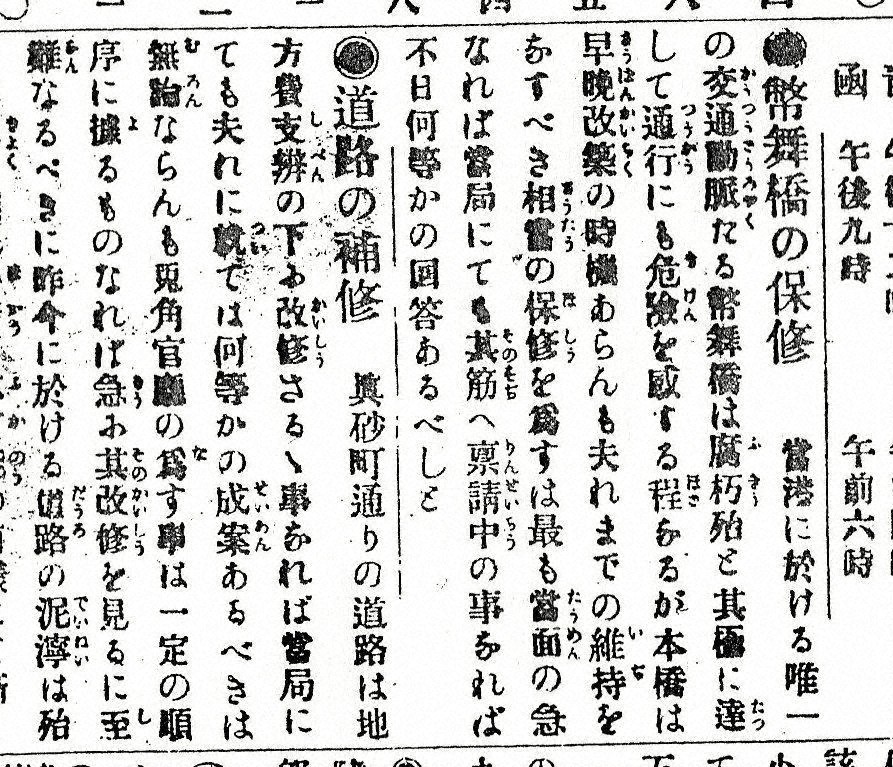 釧路の交通動脈の幣舞橋が、厳冬の寒さに耐え、柱は歪み、傾き、渡ればきしむ全道一の長い木造の頼りない橋の様子を伝えています。啄木の詩が掲載されてから間もない明治41年4月8日の釧路新聞に、幣舞橋は腐朽がひどく通行にも危険で、改築の時期が来ているが、それまで相当の補修が必要の記事が掲載されています。