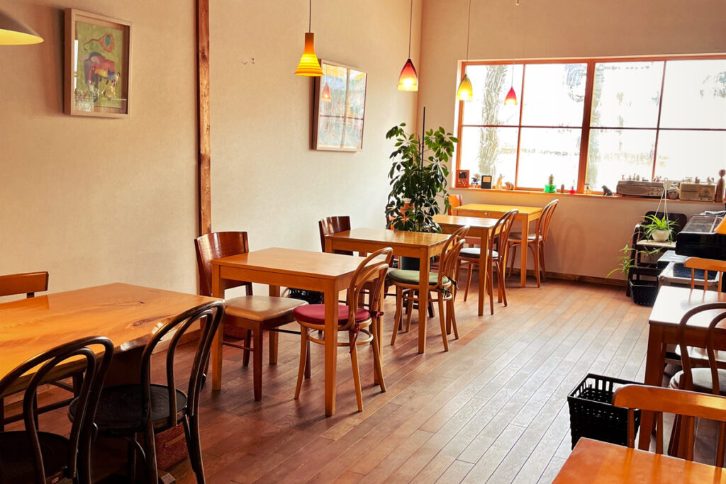 販売スペースの裏側にある喫茶はこじんまりとしていて落ち着いた雰囲気です。2人用のテーブル席が6席並び、1人でも、誰かと一緒でも気兼ねなく過ごせそうです。