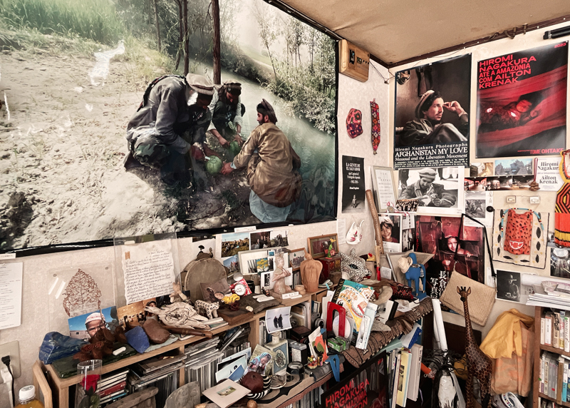壁一面を埋め尽くす写真作品、棚にぎっしりと詰まった書籍、世界各国から集められた民芸品や置物。それらが雑然としながらも不思議な調和を保って並んでいます。